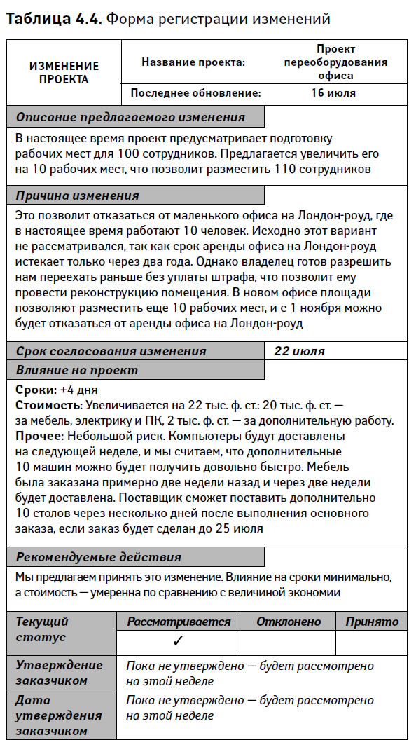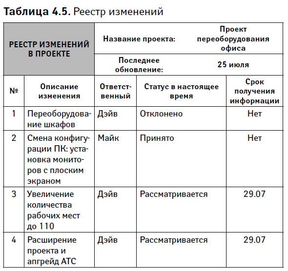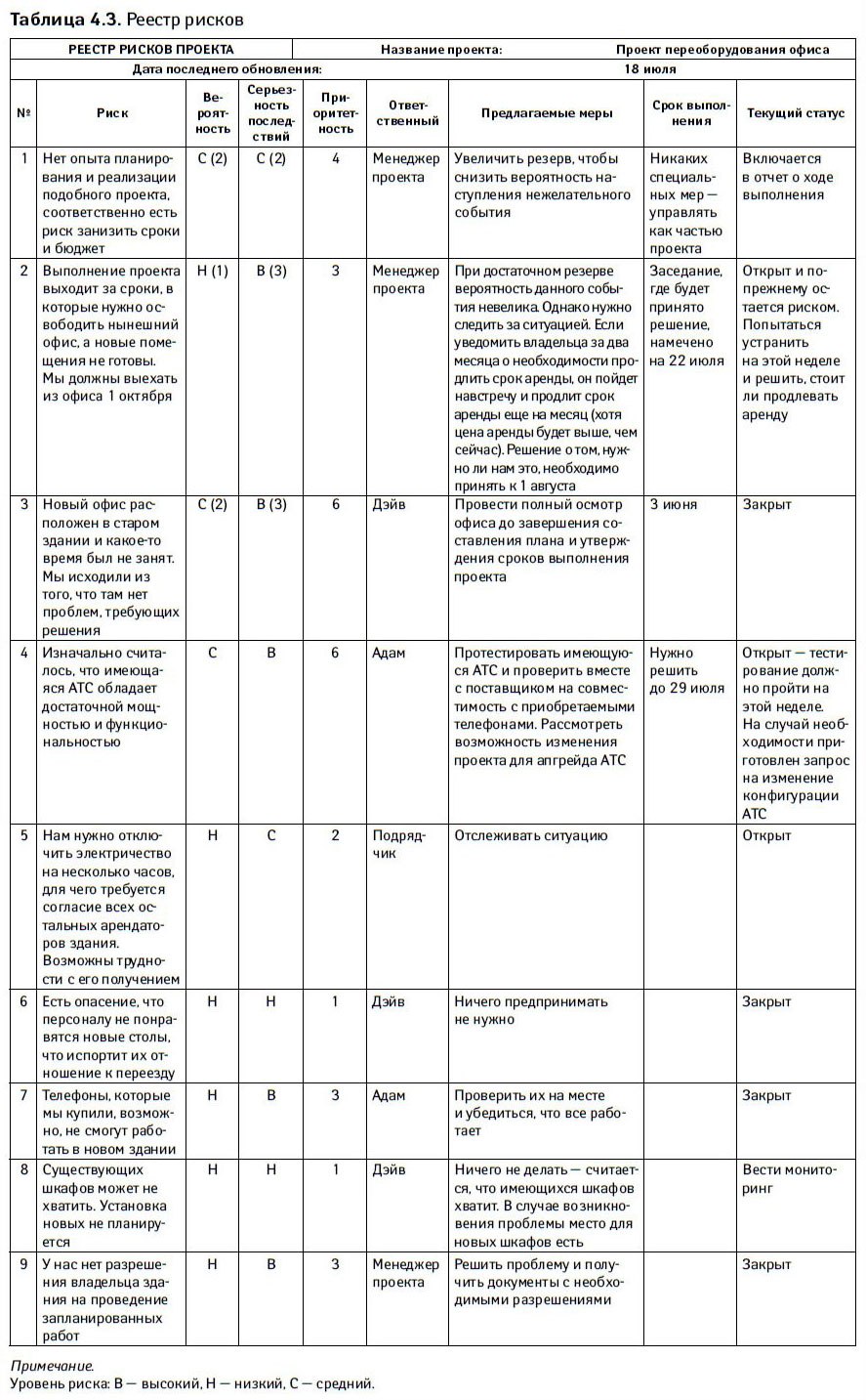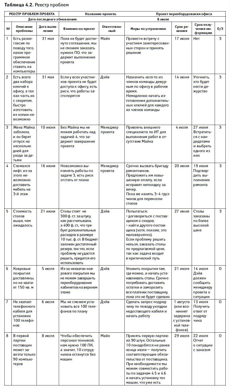 Пример реестра проблем для проекта переоборудования офиса приведен в табл. 4.2.