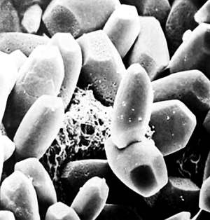 А вот пример того, как микроскоп помогает познать тончайшие процессы в организме животных и человека. Никогда не догадаетесь, что за камни изображены на втором нашем снимке. Они очень похожи на бетонные глыбы, какими укрепляют берег от размыванья или перекрывают теченье реки. Это и в самом деле камни — кальциевые кристаллы, расположенные у нас в ухе (в среднем ухе). Их назначение — следить за равновесием человека. В желеподобной массе камни плавают над лесом чувствительных волосков, нервными линиями, соединенными с особым отделом мозга. Вы поскользнулись — камни сместились и надавили на волоски, от которых пошел сигнал о нарушенном равновесии. Мозговой «компьютер» мгновенно сделал анализ и послал команду нужным мышцам — вы избежали падения.
