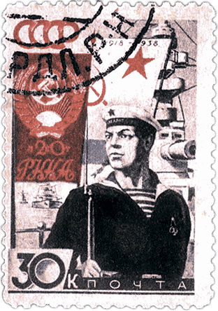 Почтовая марка СССР из серии «20 лет РККА»: матрос Балтийского флота на фоне орудий главного калибра линкора «Марат» («Петропавловск»), 1938 год