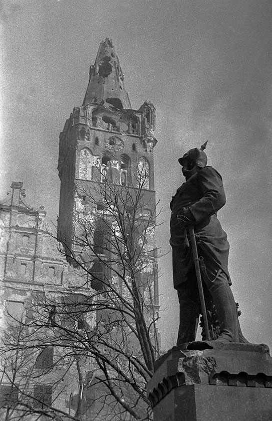 Кёнигсберг после штурма. На переднем плане – памятник Отто фон Бисмарку, на дальнем плане – замковая башня. Фото М. Савина, 1945 год