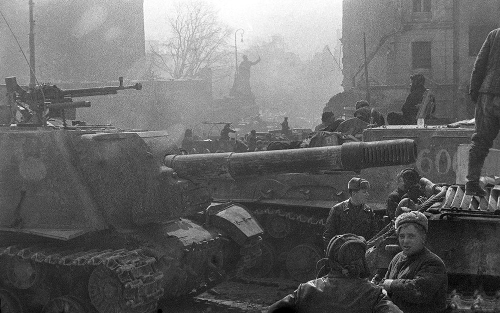 Советские тяжёлые самоходные орудия на площади Гезекусплац после штурма Кёнигсберга. На дальнем плане – памятник кайзеру Вильгельму I. Фото М. Савина, 9 апреля 1945 года