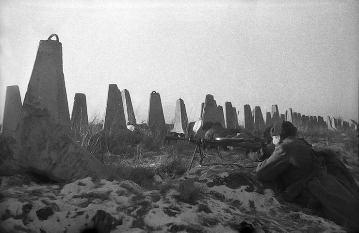 Немецкие противотанковые надолбы на границе с Восточной Пруссией. Фото М. Савина, 1945 год