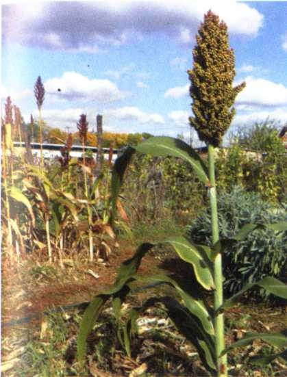 В течение нескольких лет я выбирал подходящие кулисные растения. В числе фаворитов перебывали садовая лебеда, бамия, кукуруза, космея, цикорий… А потеснило всех их сорго хлебное (фото 22).