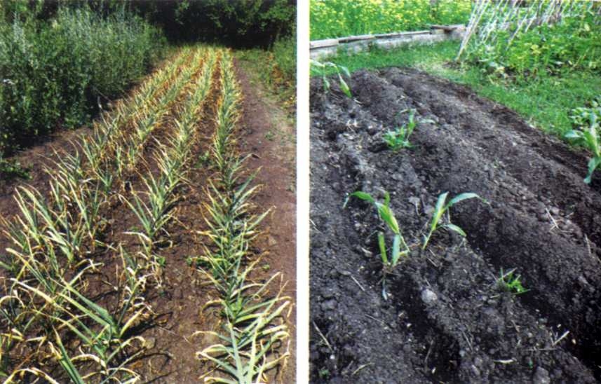 А теперь о рядках. В 11-ой главе будет сказано, что слово рядок — тоже коварная сирена. Поэтому, забегая наперед, надо «объясниться». Следующий за севом год чеснок проведет так. Весной взойдет. Вегетация будет недолгой, вскоре листва усохнет, а в земле останутся однозубки. Они будут лежать до сентября, пока ингибиторы прорастания будут разлагаться, и лишь в сентябре–октябре (в зависимости от погодных условий) появятся новые всходы, а у однозубок, как у обычных зубков, начнут отрастать корни. Выходит, что почти все лето грядка пустует. И её можно занять самыми разными культурами. А рядки облегчат размещение этих культур и возможную обработку.