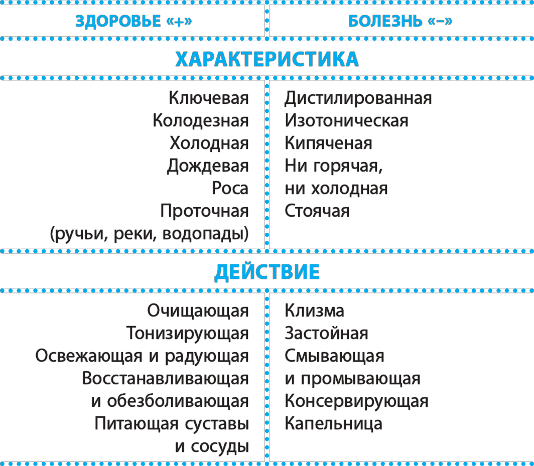 Вода – основной компонент организма человека. Это среда, в которой работают клетки, органы, ткани. Вода занимает до 90 % объема взрослого человека. Эти факты известны каждому и описаны в любой энциклопедии. Вода, как и все стихии, носит в себе энергию как созидающую, так и разрушающую. Задача этой книги – научить пользоваться энергией стихий в созидающем, восстанавливающем и исцеляющем ключе. Не отрицая необходимости применения воды в условиях больницы в виде изотонических и гипертонических растворов (в том случае, когда больной человек находится в условиях стационара), я хочу обратить внимание на лечебные свойства воды, которыми могут пользоваться люди, желающие выбраться из болезни и избавиться от последствий любой травмы. Думаю, никто не будет отрицать оздоровительные характеристики воды, изложенные в табл. 7, в графе «Здоровье «+». Но почему тогда любым пациентом, которому я рекомендую в течение 5 секунд принимать холодную ванну с головой сразу после сна, овладевает страх? Такие больные сразу вспоминают про переохлаждение (хотя я говорю всего о 5 секундах!), циститы, пиелонефриты, склонность к ОРЗ, бронхиты. Многие из них забывают, что посещают святые источники, во время крещенских морозов окунаются сами и окунают своих детей в прорубь. Во время отпусков могут стать под водопад и искупаться в горной речке, если окружающие люди делают то же самое, вылить на себя ведро холодной воды из колодца во время жары. И при этом они не заболевают, не простужаются, не переохлаждаются. Видимо, потому, что рядом есть мощный психотерапевтический фактор. В одном случае это легенда, в другом – священник, в третьем – друзья, перед которыми неловко бояться воды. Есть еще прорубь или сугроб снега после русской бани.
