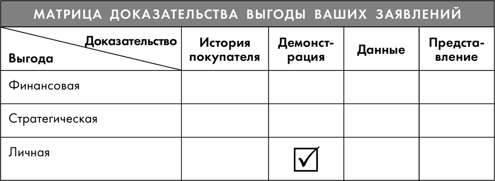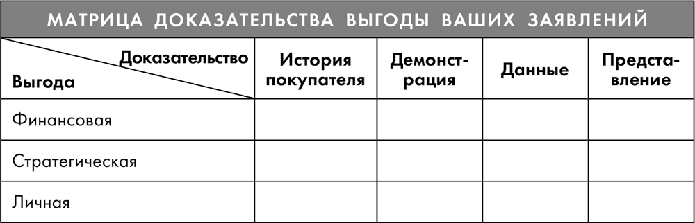 Представляя доказательства выгоды вашим потенциальным клиентам, вы имеете два эффективных варианта: вы можете следовать по матрице в вертикальном направлении, рассказывая историю, включающую в себя все три категории – финансовую, стратегическую и личную, – или же вы можете использовать матрицу горизонтально, приводя различные доказательства в каждой из четырех категорий.