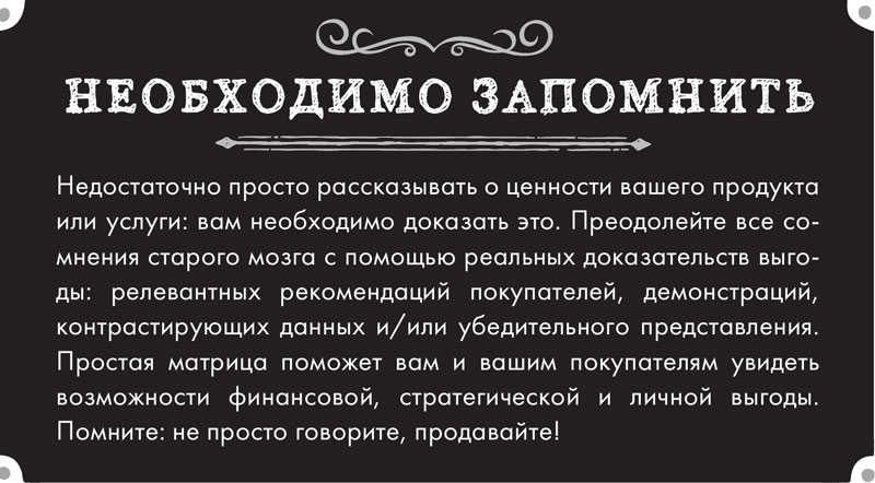 Помните, что доказательства выгоды имеют основное значение в вашем сообщении. Они должны быть реальными, основанными на фактах, и доказуемыми, для того чтобы оказать влияние на старый мозг вашего потенциального клиента. Убедитесь, чтобы вся предоставляемая клиентам информация имела определенную ценность для них. Задайте себе вопрос: «Рассказываю ли я им о характеристиках и преимуществах или же я действительно продаю то, что сможет оказать воздействие на их старый мозг? Нужно ли мне использовать эту информацию, для того чтобы помочь им принять решение о покупке, или я всего лишь разбавляю свою ценность ненужными подробностями?» Следующие четыре слова говорят об этом: «Не просто говорите, продавайте!»