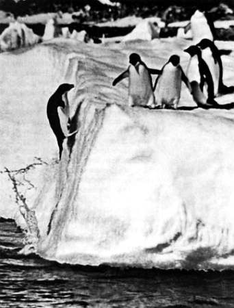 Для ловли рыбы пингвины иногда выстраиваются изогнутой цепью и гонят рыб, сбивая их в кучу, а в нужный момент проворно хватают. Сами они тоже могут стать жертвой огромного хищника — зубастого тюленя по прозвищу «морской леопард». Он только и ждет момента, чтобы сцапать жирного водолаза. Одно спасенье — «летать» возможно быстрее, а лучше свечкой выпрыгнуть из воды на льдину. В кино я видел захватывающее зрелище: пингвины, как мелкие окуньки от щуки, вылетали на отвесный двухметровый край льдины. (Вот тут-то и вспомним о тренировках по прыжкам из воды.)