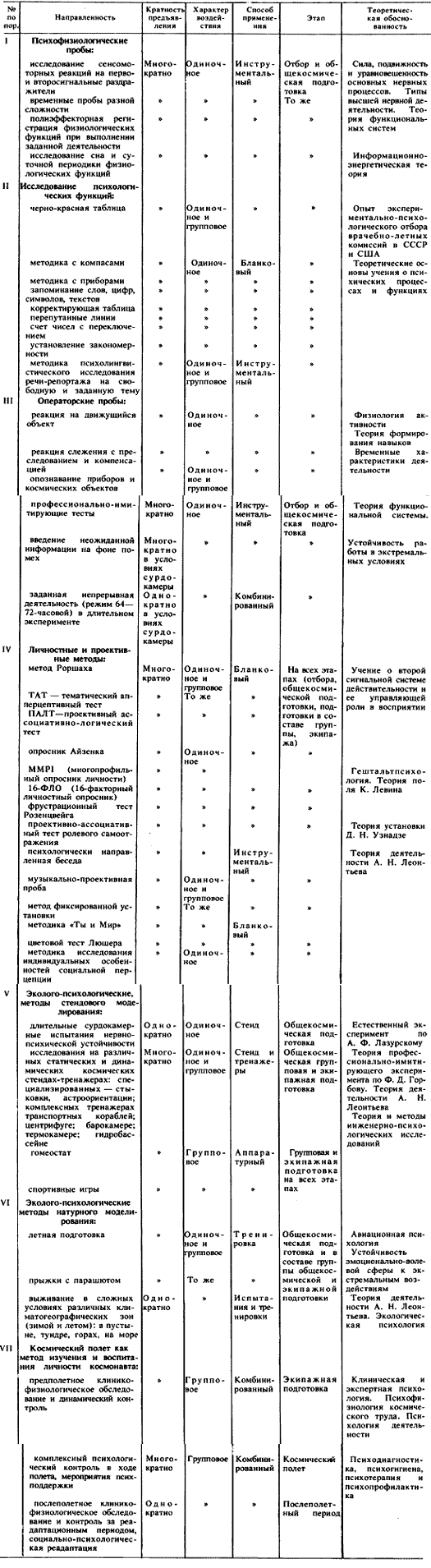 В табл. 10 в дифференцированно-обобщенном виде представлены данные, характеризующие в определенной мере объем и содержание практических медико-психологических мероприятий, направленных на профессионально-психологическое изучение и воспитание личности космонавта в процессе отбора и подготовки к выполнению космического полета.