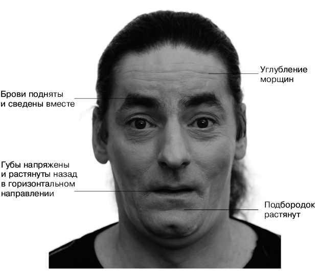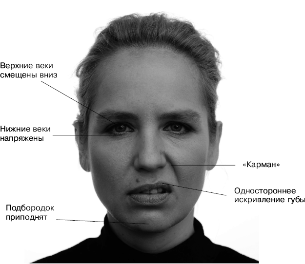 Признаки фальши: напряжение мышц вокруг глаз. Движение/напряжение бровей. Напряжение скул и мышц нижней челюсти.