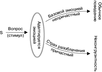 Совершенно другую картину мы имеем, когда дело касается виновного испытуемого. Мотивом, который становится доминирующим для человека, совершившего асоциальный поступок, является мотив самосохранения, избегания угрозы наказания, то есть в основе лежит страх, именно он заставляет человека вести себя неконгруэнтно, рассогласовывать сигналы, посылаемые вовне. Причастному также свойственно желание проявить себя как личность социальную, он точно так же пытается вести себя в соответствии со своими базовыми поведенческими стереотипами, но, поскольку есть страх, связанный с угрозой наказания, есть совершенный поступок, идущий вразрез с ценностями, возникает несоответствие поведенческих признаков, которые может увидеть верификатор.