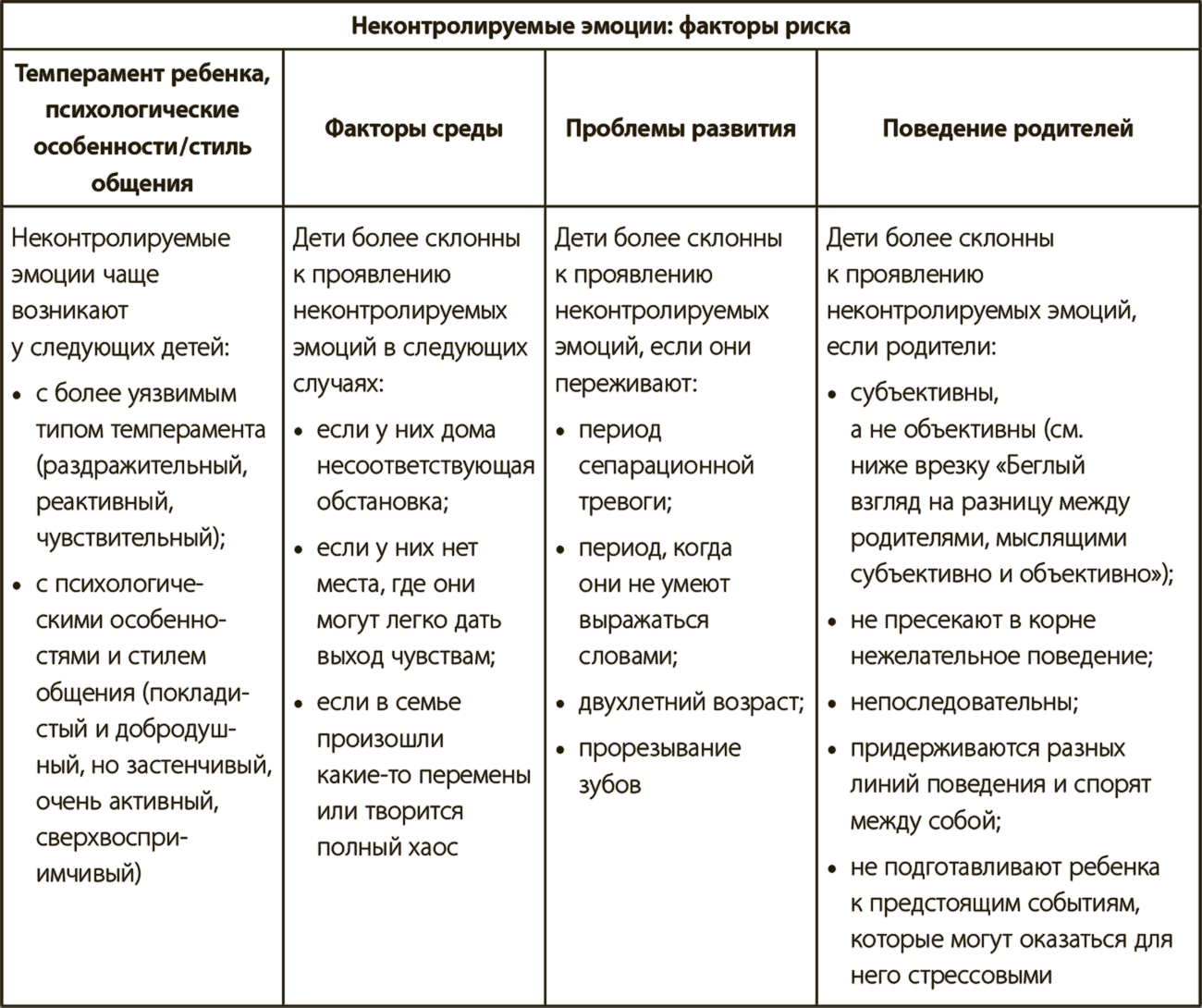 Как подытожено в таблице ниже, риск возникновения неконтролируемых эмоций у ребенка возникает под влиянием четырех факторов: это темперамент ребенка, условия внешней среды, проблемы развития и, пожалуй, самое главное – ваше поведение. Четыре фактора риска явно взаимосвязаны, хотя иногда один из них может доминировать. В разделе после таблицы я останавливаюсь на каждом из этих элементов.