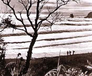 Часа два пропели мы у берега, «на краю света», прощаясь с Камчаткой. Утро в тот день было тихое, солнечное. Океан катил к суше пологие, остекленевшие волны. Мы шли, разглядывая ночные следы на мокром песке. Десятка два куличков небоязливо рылись в оставленном приливом мусоре. Низко, повторяя очертания берега, в дозорном полете проследовал белоплечий орлан. Резвый ворон игриво пикировал на тяжелую птицу. Но орлан летел, будто не видя его. Отсветы солнца ярко искрились там, где вода разбивалась о камни. Оксан к горизонту уходил пологой горой. В синеватой дали мелькали белые хлопья чаек и виднелся дымок — к Петропавловску шло какое-то судно. На часах было девять часов утра, а в Москве часы в это время пробили полночь, до нового дня там было еще далеко.