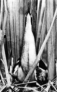 На ветру камыши шуршали и шевелились, что помогло подойти к гнезду незаметным. Птица и я друг друга увидели одновременно. Выпь предпочла затаиться, сильно вытянув шею и почти слившись со стеблями осоки и камышей. Не делая резких движений, я сделал несколько снимков. Запомнились острый и длинный клюв птицы, желтые «очки» глаз и толстая — конусом — шея. Долго наседка терпеть меня не могла. Шевельнулась и, задевая широкими крыльями мешавшие взлету растенья, поднялась и почти сразу же опустилась среди прутиков тростника.
