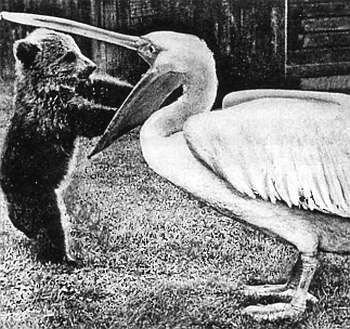 Между животными в зоопарке частенько устанавливаются дружеские отношения. Жертва в дикой природе тут может стать приятелем хищника. Особенно в этом случае интересна площадка молодняка, тут дружба и панибратство — обычное дело. Посмотрите на снимке, как медвежонок бесцеремонно запускает лапу в подклювный мешок пеликана. Но и взрослые звери — явные антиподы в природе, — случается, мирно живут в одной клетке. В зоопарке Калининграда я, помню, снимал живших в одной вольере петуха и лису. В истории Московского зоопарка значится многолетняя дружба льва с кобельком Тобиком. А в зоопарке Йоханнесбурга кровожадный медоед соседствовал с аистом. Особый случай — чувство родства. В Берлинском зоопарке я видел белотелую хавронью, лежавшую бок о бок с такой же величины кабаном. И есть у меня снимок, сделанный в маленьком зверинце, где держали животных для киносъемки. Тут с хозяйкой вольера — рысью — лежали на «нарах» кошки, приходившие навещать «родственницу».