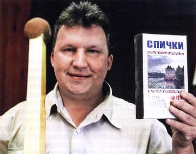 На снимке этом — хранитель музея Василий Абакулов. Он держит спичку, изготовленную к юбилею Балабановской фабрики. Внушительно выглядит увеличенная, словно для Гулливера, палочка-зажигалочка. Совсем не похожа она на ту, которой до сих пор пользуются бушмены африканской пустыни.