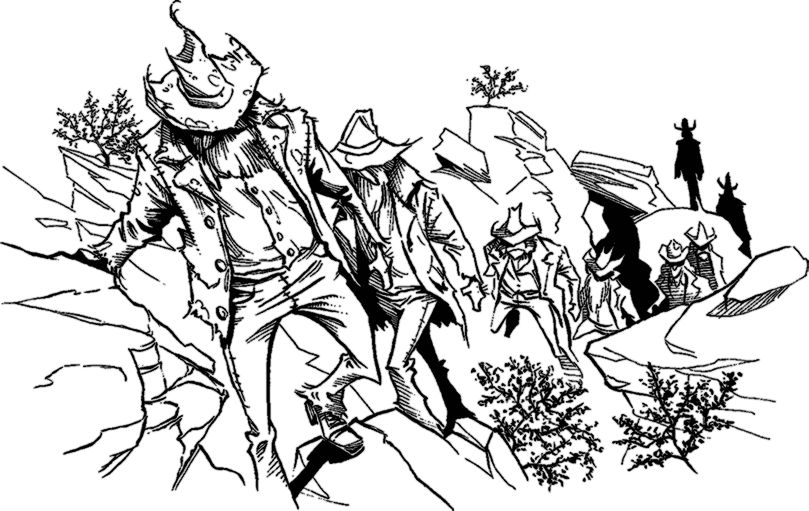 Следопытам не пришлось долго доказывать, что они не плод галлюцинации. Один из них взял девочку на руки, а двое других, поддерживая ее истощенного спутника, стали помогать ему спускаться вниз, к повозкам.