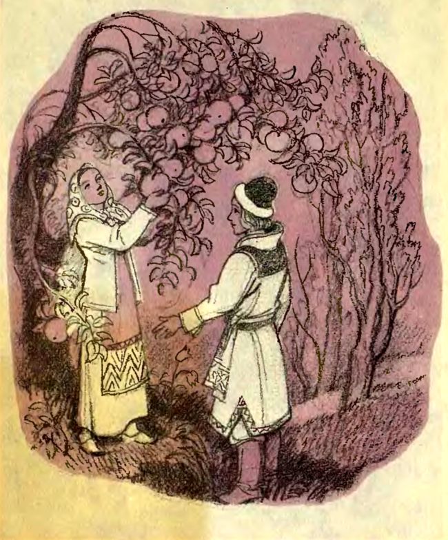 Подошла Хаврошечка — веточки к ней приклонились, и яблочки к ней опустились. Угостила она того сильного человека, и он на ней женился. И стала она в добре поживать, лиха не знать.