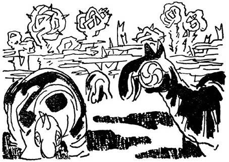 На обширных пространствах красновато-зеленых лугов паслись стада весьма диковинных животных, отдаленно напоминавших наших овец или коз. Их заметно удлиненные туловища, без шерсти, на очень коротеньких толстых ножках, перемещались в высокой густой траве. На сравнительно маленькой голове сидели два огромных глаза и пара невысоких тупых шишек вместо рогов.