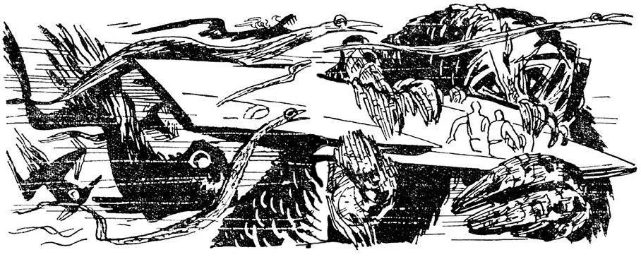 Потом наше судно превращается в своеобразный гидромобиль. У него вырастают подводные крылья-плавники. И вот мы мчимся по подводной тайге, бесшумно разбрасывая в стороны причудливые заросли подводных растений. Огромные тупорылые рыбы в панике разбегаются на нашем пути. Некоторые бестолково тычутся в прозрачные стены рубки и тут же отскакивают в стороны. На одном из виражей мы налетаем на гору-животное, оказавшуюся гигантским ракообразным. Гидромобиль сильно встряхивает.