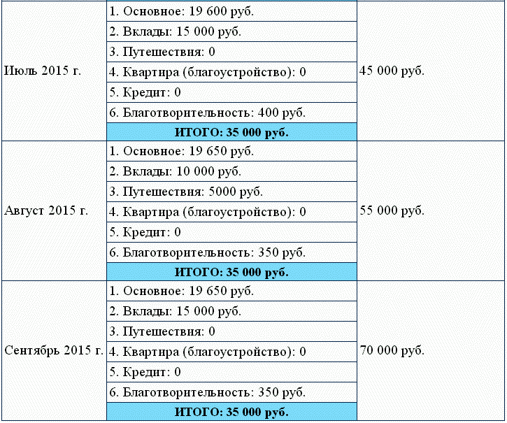 Здесь важно так же, как и в инструменте № 1, выработать внутреннюю дисциплину и четко следовать плану на год. Даже скажу точнее: следует выполнять приоритетный для себя раздел расходов, а остальные траты – как получится. То есть, несмотря ни на что, необходимо во что бы то ни стало отчислить во «Вклад» 10 000 рублей в апреле 2015 года (см. табл. 6), и если на остальное – оно же на основное – останется меньше денег, чем хотелось бы, значит, в этом месяце будет так. Нужно быть перед самим собой непреклонным и действовать согласно планам на полгода и на год. Только четкое выполнение данных документов позволит вам достичь тех результатов, которые вы хотите. Что, в свою очередь, выведет вас на тот уровень жизни, жить которым вы желаете.