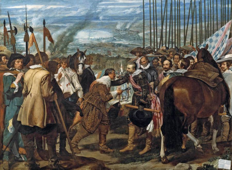 На историческую тему Веласкес написал всего одну картину. Но это полотно оказало значительное влияние на ход развития мировой живописи. Картина называется «Сдача Бреды». На ней изображен эпизод испано-голландской войны, когда испанцы принимают ключи от сдавшегося им голландского города. Традиционно в подобных исторических произведениях использовались мифологические мотивы, обязательно присутствовала крылатая богиня Ника или иные аллегорические персонажи. У Веласкеса ничего этого нет. Его картина представляет собой групповой портрет, безупречный по композиции, с великолепно переданным вторым планом и открывающимся вдали горизонтом.