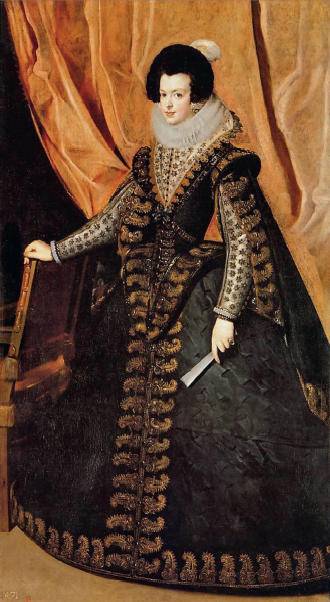 В левой части картины мы видим работающего у мольберта художника. Это единственный достоверный автопортрет Веласкеса. В руке художника кисть. Но кого он рисует? Инфанту Маргариту? Нет, он смотрит не на нее. Его взгляд направлен прямо на зрителя, который благодаря искусно выбранному ракурсу чувствует себя входящим в залу. Зритель находится на месте королевской четы, которую и пишет Веласкес, и которая отражается в зеркале, висящем в глубине залы, прямо напротив нас.