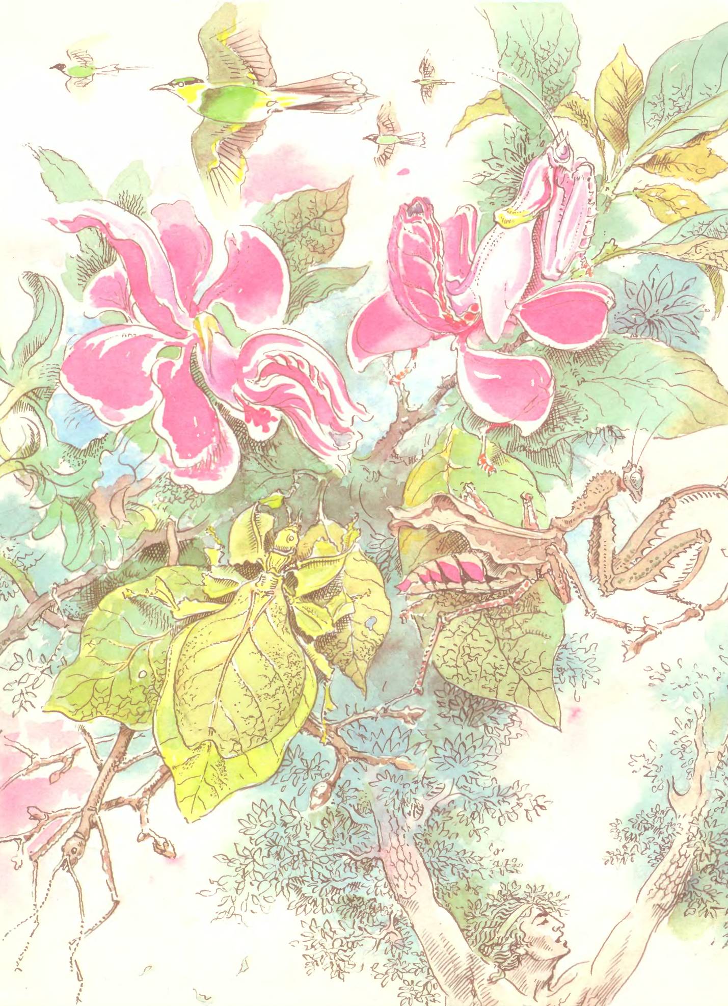 Но вот еще более фантастическая метаморфоза. Богомол принял обличье цветка. Такое и во сне не увидишь: по тропинке движется цветущая орхидея! Да, да, именно орхидея. Самое волшебное и загадочное из растений Земли.