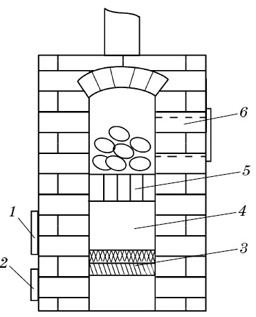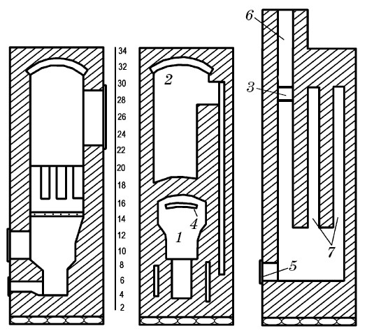 В своде находятся щели, через которые проходят дымовые газы. Затем они пронизывают толщу булыжника и чушек и проникают в два опускных канала, расположенных сбоку. Оттуда они выходят в дымовую трубу.