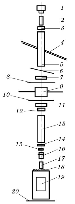 Рис. 32. Схема сборки дымохода: 1 — дефлектор;2 — труба; 3 — верхняя заглушка на трубу с изоляцией; 4 — противоливневая защита; 5 — труба с изоляцией (50 мм); 6 — фланец под крышу под угол; 7 — верхняя заглушка на проходной стакан; 8 — фланец;9 — проходной стакан в перекрытие; 10 — фланец;11 — нижняя заглушка в проходной стакан; 12 — хомут усиленный; 13 — труба с изоляцией (50 мм);14 — нижняя заглушка в трубу с изоляцией; 15 — хомут усиленный; 16 — шибер; 17 — труба; 18 — камни; 19 — печь; 20 — подставка под печь с термозащитой