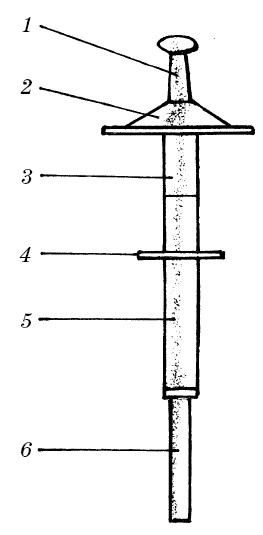 Рис. 33. Конструкция дымохода: 1 — оголовок; 2 — противоливневая защита; 3, 5 — сэндвич-труба; 4 — потолочно-проходной узел; 6 — одноконтурная труба