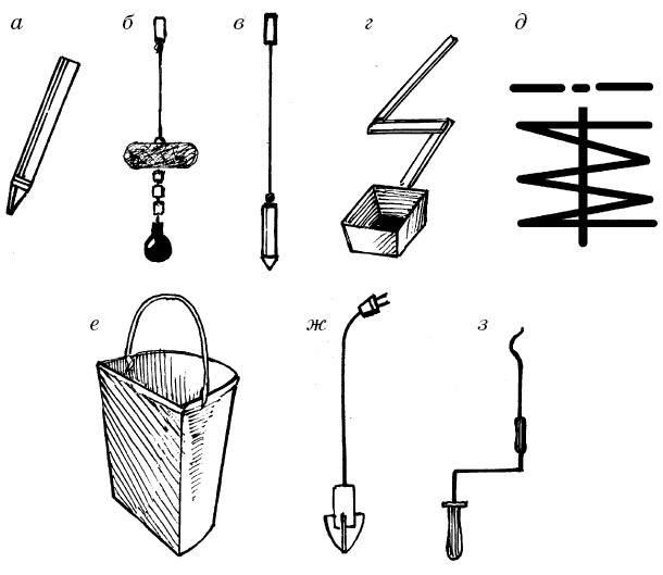 Рис. 6. Трубочистные инструменты и приспособления: а — зубило; б — веревка с гирей; в — снаряд; г — ложка; д — ерши; е — ведро; ж — электрическая лампочка в металлической оплетке; з — проволока