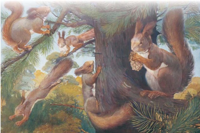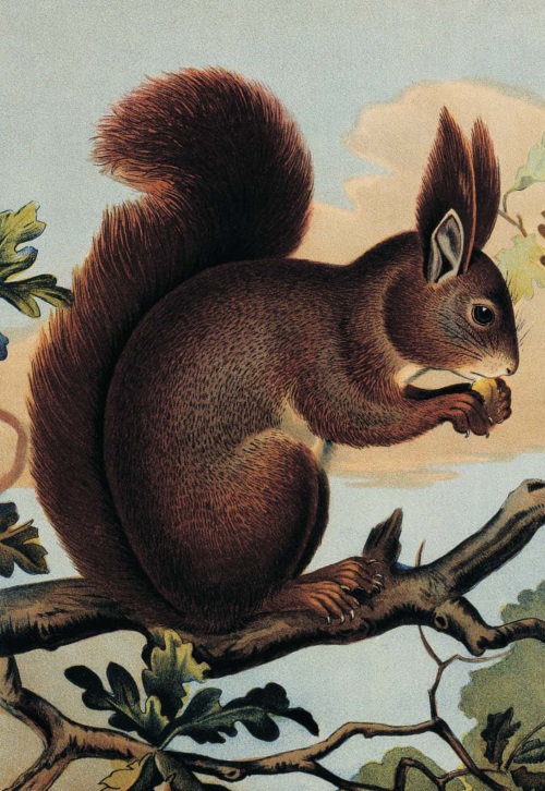 Осенью я велю собирать для них жёлуди и буковые орешки; весной же и зимой я разделяла все это между голодными белочками, обильно разбрасывая жёлуди и орешки, вместе с другими зёрнами, под упомянутым уже выше старым дубом. Этот корм является также большою притягательною силой и для соек, диких голубей, поползней, ворон и всякой прочей пернатой публики.