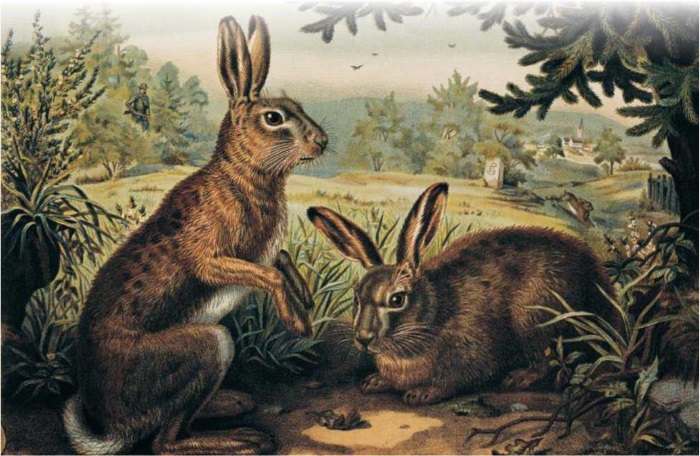 Заяц ходит ночью по полям и лесам без страха и прокладывает прямые следы; но как только приходит утро, враги его просыпаются: заяц начинает слышать то лай собак, то визг саней, то голоса мужиков, то треск волка по лесу и начинает от страху метаться из стороны в сторону. Проскачет вперёд, испугается чего-нибудь – и побежит назад по своему следу. Ещё услышит что-нибудь – и со всего размаха прыгнет в сторону и поскачет прочь от прежнего следа. Опять стукнет что-нибудь – опять заяц повернётся назад и опять поскачет в сторону. Когда светло станет, он ляжет.