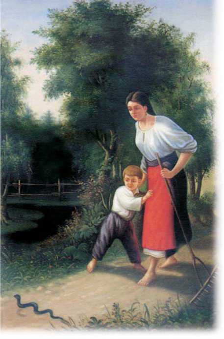 Один мальчик у нас так и умер от гадюки. Укусила она его около самого плеча, и, прежде чем пришёл Охрим, опухоль перешла с руки на шею и грудь: дитя стало бредить, метаться и через два дня померло. Я в детстве много наслушался про гадюк и боялся их страшно, как будто чувствовал, что мне придётся встретиться с опасной гадиной.