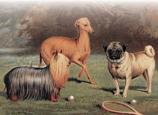 К Полкану подбежал маленький Мопс и стал на него кидаться и лаять; хватал его зубами за огромные лапы, за морду и, казалось, очень надоедал большой и угрюмой собаке.
