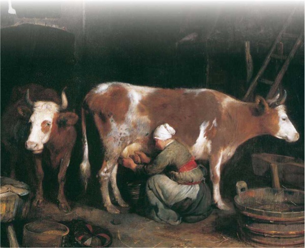 Она травушку рвёт, жвачку жуёт, пойло пьёт, мычит и ревёт, хозяйку зовёт: «Выходи, хозяюшка; выноси подойничек, чистый утиральничек! Я деточкам молочка принесла, густых сливочек».