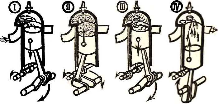 Под влиянием образующегося высокого давления поршень движется снова вниз, передавая значительное усилие через шатун к коленчатому валу и заставляя его вращаться. При этом движении поршня объем полости цилиндра увеличивается, давление газа постепенно падает и к моменту нижнего положения поршня оно делается равным 4–5 атмосферам.