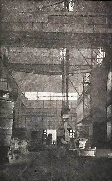 «В кузнице были три линии молотов, — пишет побывавший там инж. Штейман, — но туда ухитрились поставить еще две линии. Все станки расположены были настолько близко, что пересечь цех стало совершенно невозможно и для этой цели нужно было выходить на специальную площадку. У средних линий печей нельзя было отвести отходящих газов. От кожухов нельзя было протянуть металлических труб большого диаметра, так как они мешали бы движению кранов».