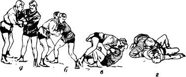 В некоторых случаях можно нападать на противника, не срывая его оборонительных захватов. Чтобы сделать такое нападение, нужно сблизиться с противником посредством ряда специальных подходов к броскам. Если, например, противник захватил ваши рукава или плечики куртки и не подпускает к себе, можно сблизиться с ним путем перекоса прямоугольника, образованного четырьмя руками и двумя туловищами самбистов. Для этого нужно, сделав шаг левой ногой вперед и влево, сильно потянуть обеими руками вправо. Противник не сумеет удержать прежнее расположение своих рук по отношению к туловищу, между руками и двумя туловищами вместо четырех прямых образуется два острых и два тупых угла. Сближение с противником произойдет из-за уменьшения высоты четырехугольника. С этим сближением удобно проводить заднюю подножку, отхват и особенно заднюю коленную подсечку. Если противник захватил одежду на ваших рукавах или плечиках куртки и не подпускает вас к себе, то можно сблизиться с ним путем приседания, наклона туловища и небольшого шага вперед. В этом случае противник, не имея возможности удержать на вытянутых руках ваш вес, опустит руки. Прямоугольник, образованный руками, туловищами самбистов и ковром, превратится в четырехугольник, высота которого будет меньше высоты прямоугольника. Это-то и позволяет вашему туловищу приблизиться к туловищу противника и особенно вашим рукам — к его ногам. С этим сближением удобно проводить броски с захватом двух ног, а также броски с захватом одной ноги.