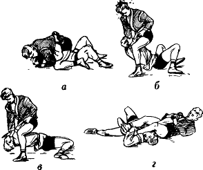 Если же противник, находясь на удержании со стороны головы, сцепил руки за вашей спиной, перейдите в положение сидя возле левого бока противника и, прижав правой ногой левую ногу противника к ковру, проведите выкручивание плеча обратным подниманием локтя (рис. 6).