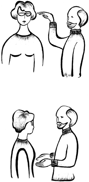 «Направление энергии» может осуществляться либо одной рукой, либо двумя руками одновременно (рис. 7а, 7б). В последнем случае ладони должны быть параллельны друг другу и располагаться на расстоянии 2–3 см друг от друга. Пальцы оператора перпендикулярны телу пациента. Представьте себе, что из ваших средних пальцев как бы исходит поток целительной энергии. Энергия направляется на различные зоны уха, при этом средние пальцы ориентируются на слуховой проход, на переносицу, на области почек, надпочечников, половых органов, печени. В последнем случае руки массажиста располагаются под углом в 45° к правому подреберью больного, причем оператор находится слева от пациента.