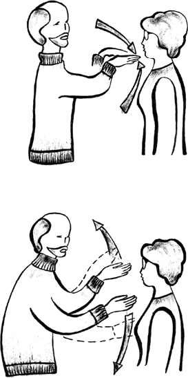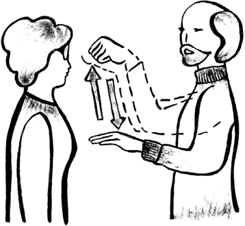 Прием особенно часто используется при артериальной гипотензии и астенических состояниях после перенесенных истощающих заболеваний. «Накачка» выполняется одновременно двумя руками. Кисти должны быть расположены на одном уровне от пола и параллельно, пальцы направлены к телу на уровне солнечного сплетения. Затем руки медленно поднимают вверх, «обтекая» тело до подбородка, с ощущением обратной связи (как бы поднимая энергию). На этом уровне кисти сжимаются в кулак, как бы отодвигаются от тела на оператора, и опускаются вниз до исходного положения. Здесь кисти разжимаются, сбрасывая энергию (рис. 8).