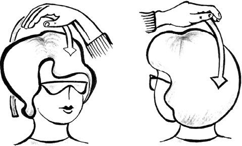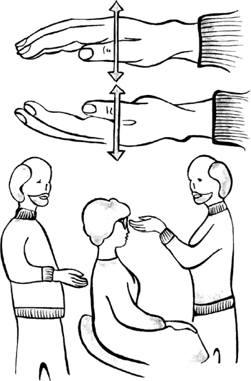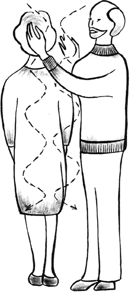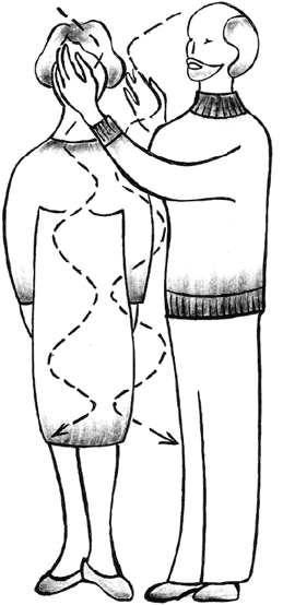 «Распределение энергии» над головой может производиться и другим способом: оператор проводит рукой над головой вдоль средней линии от лба к затылку и в обратном направлении (рис. 4).