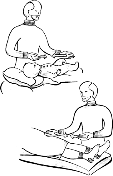 При выполнении приема руки оператора находятся на одной горизонтали с плечевыми суставами пациента, ладонями вниз, пальцы перпендикулярны телу (рис. 6). Производят плавное сведение и разведение рук с большим размахом – на 5–7 см шире плеч.
