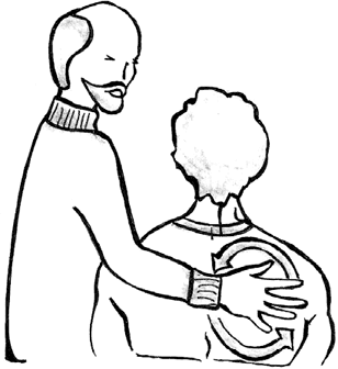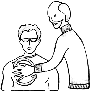 После завершения любого сеанса бесконтактного массажа следует провести контактный массаж в области сердца. Для этого оператор становится справа от пациента; одна рука ладонью ложится на грудную клетку пациента спереди на область сердца, другая ладонь – на верхнюю часть спины, как бы в зеркальном отображении. Проводятся энергичные контактные круговые движения одновременно двумя руками по часовой стрелке (рис. 13).