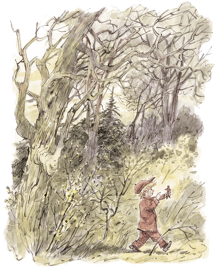 Малыш пошёл посмотреть на деревянные фигурки на полке. Он поднял Щепкина повыше, чтобы тот поближе познакомился с троллем, но Щепкин только напугался, пришлось разрешить ему забраться снова под свитер.