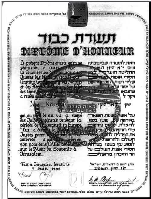 Диплом к медали Праведника мира, врученный Яну Карскому 7 июня 1982 г. Институтом Яд Вашем в Израиле после того, как он посадил дерево в Аллее праведников.