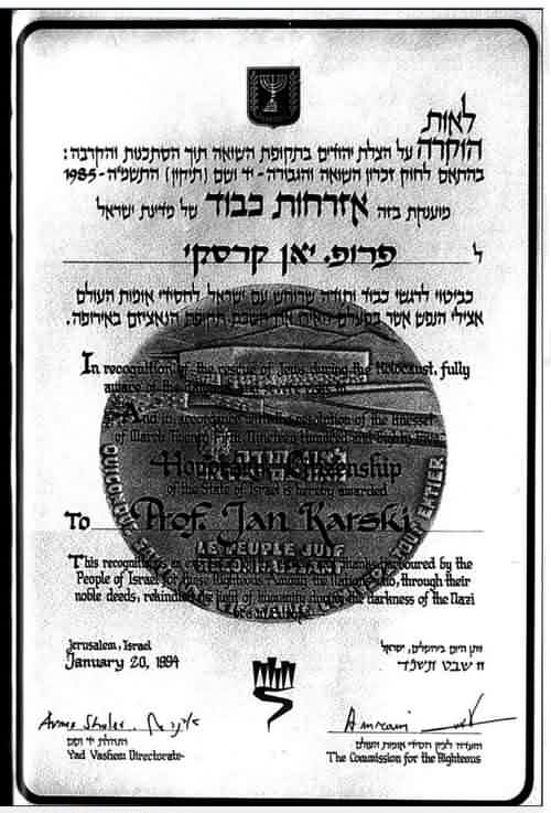 Диплом почетного гражданина Израиля, врученный Яну Карскому 13 мая 1994 г. в посольстве Израиля в Вашингтоне на устроенной в его честь торжественной церемонии.