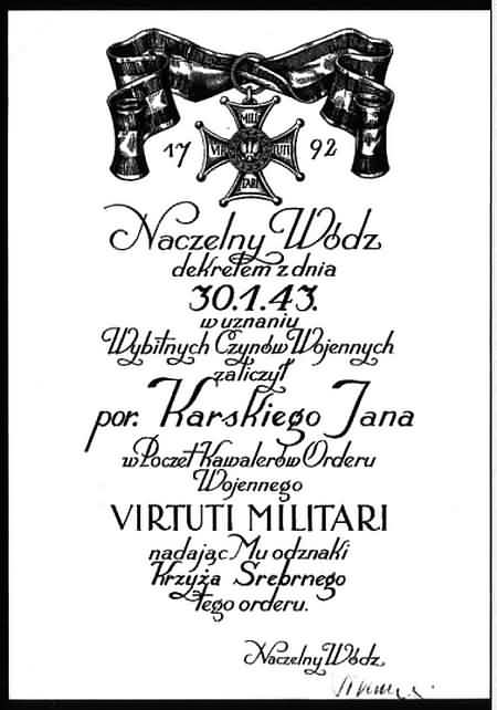 Не знал о нем и генерал Сикорский, глава польского правительства в изгнании, когда в январе 1943 года вручил орден Virtuti Militari Яну Карскому в Лондоне.